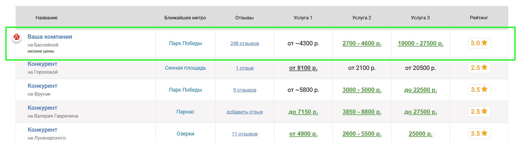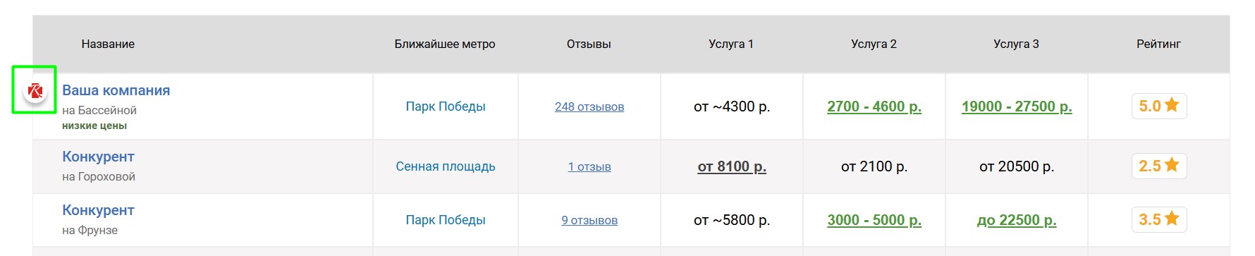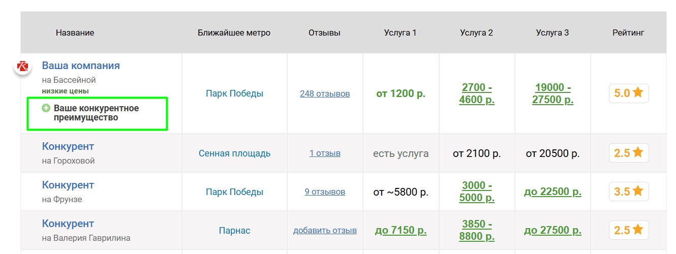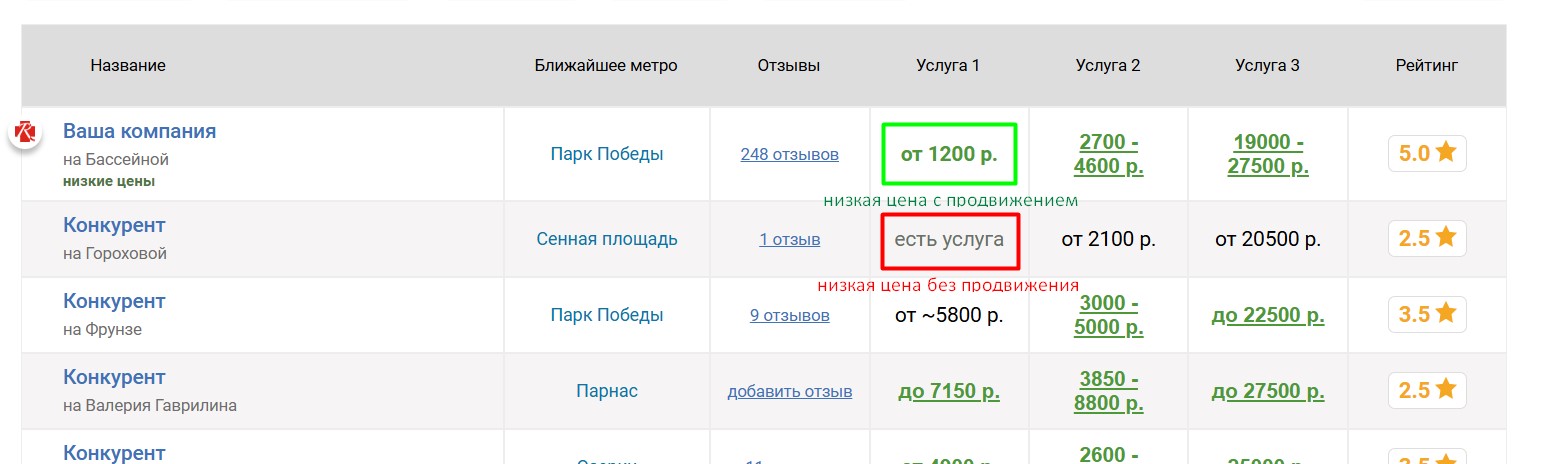 Вокруг продвигаемого таким образом агентства выбирается некоторое количество ближайших конкурирующих агентств, продвигаемое агентство попадёт к ним в таблицу «Сравнение по ценам», которая выглядит следующим образом: